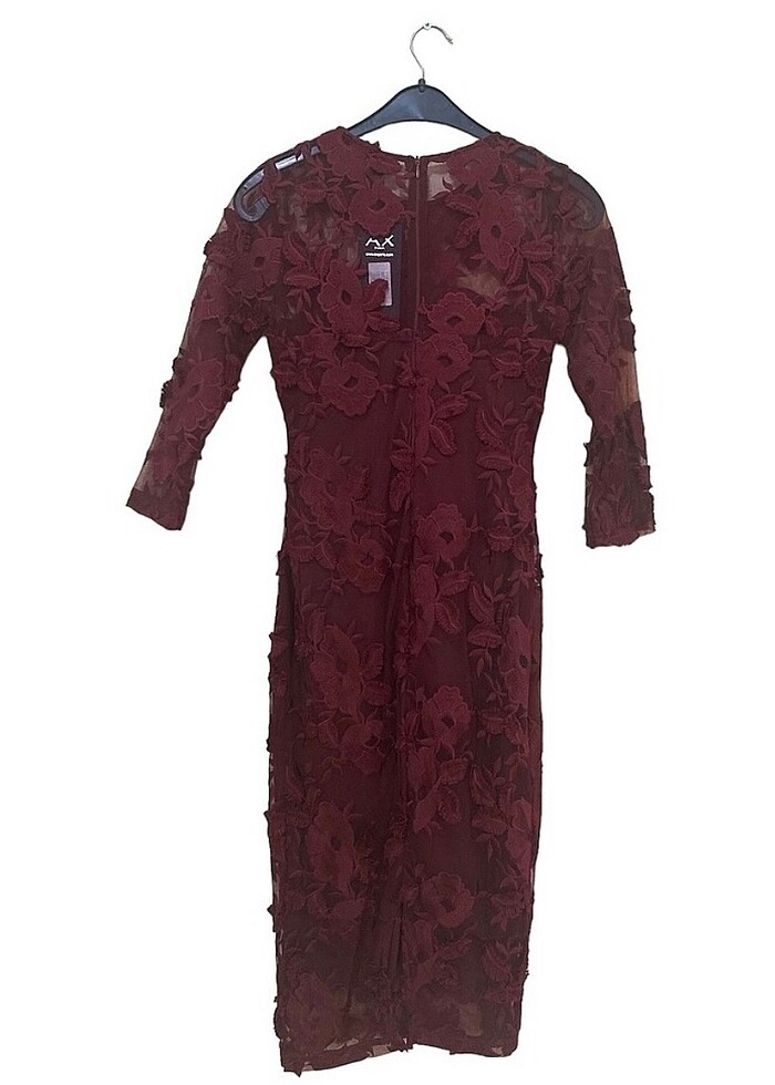 Kolları ve üst kısmı tül detaylı elbise. Üste tam oturan dar kalıplı bir elbisedir. Yurtdışından alındı. Yeni, etiketli. Bordo Ax Paris Elbise #tülelbise #kadın #bordo #axparis