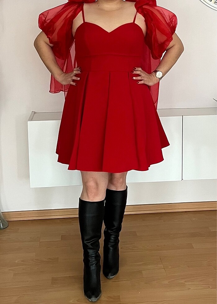 Ürünü sadece 1 kez giyindim. Kırmızı krep demor kumaş ile tasarlanarak yapıldı. Bedeni XL ama sırtında ki ipler gevşetildiğinde XXL beden de oluyor. Kollarındaki tüller ve arkasındaki fiyonk sonradan yapıldı. İnce kumaş ipliği ve çıtçıtlarla tutturuldu. Çıkartılmak istenirse iplerden çekip çıkarılıp normal bir elbise olarak da giyilebilir. Yaka kısmı öpücük yaka şeklinde yapıldı. İstenirse kına düğün de abiye olarak istenirse normal elbise olarak giyilebilir. Alacak kişinin şimdiden güzel günlerde giymesini dilerim