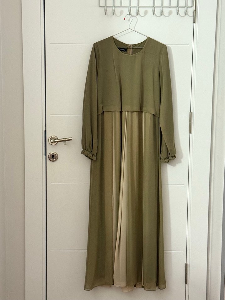 Uzun tesettür elbisesi şifon krem ve haki renkli yeni gibi çok az giyildi