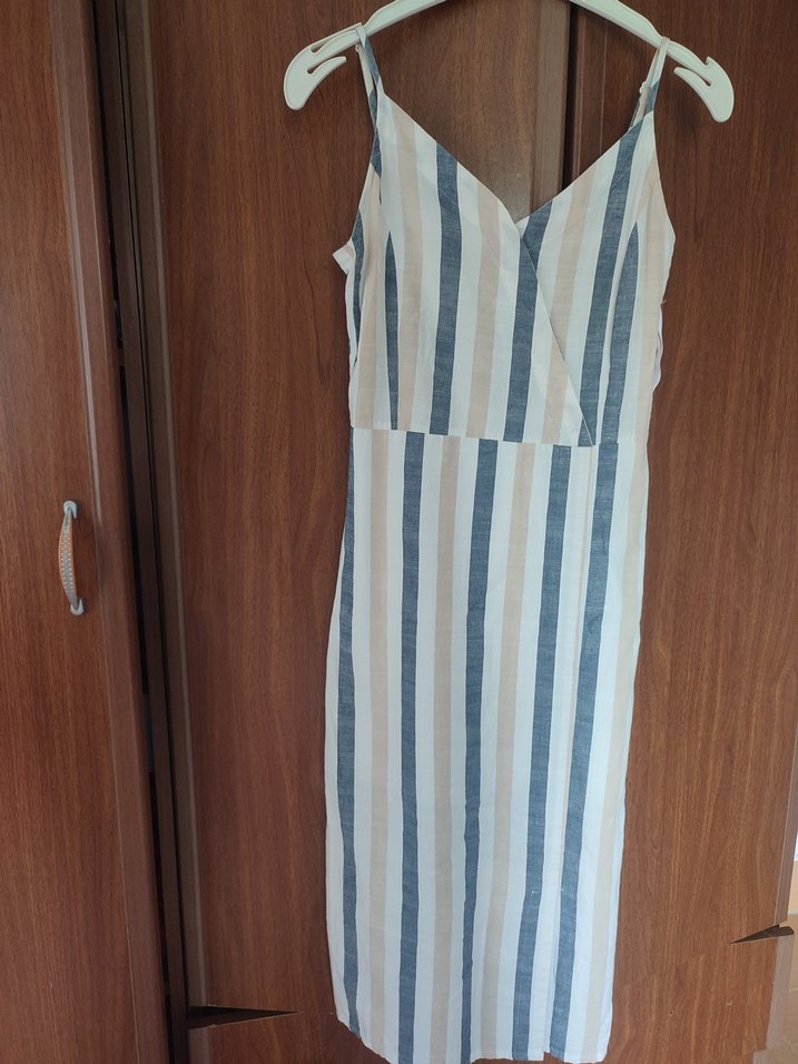 Bej renkli, çizgili ve ince askılı diz altı elbise, keten pamuklu kumaş çok rahat