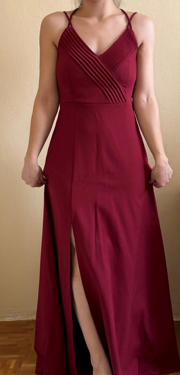 Nervür detaylı. Bordo. 40 beden. İpli. Yırtmaçlı. 168 boyda 5 cm topuklu ile giydim. Göğüs kısmı 15-16 cm. Hiçbir sorunu yoktur. İade kabul etmiyorum.