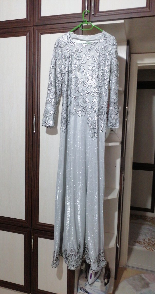 Elbise Gri Nakışlı Uzun Kollu Abiye Elbise 38 39 beden