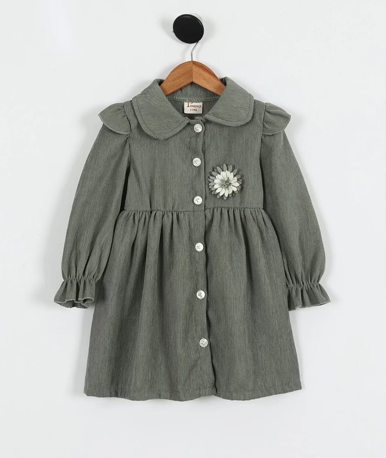 Gevşek kesim, uzun kollu, düğmeli ve yakası notched lapel olan keten kız elbisesi. Nakış detayları ve küçük çiçek aksesuarı bulunur.