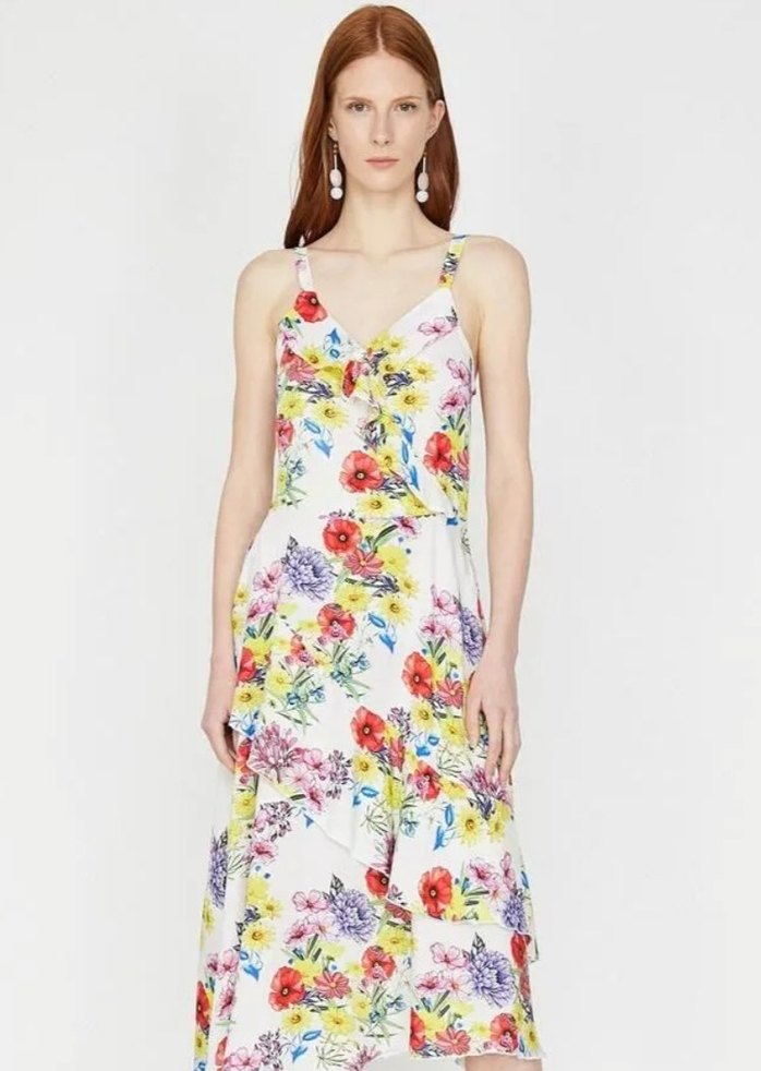 Çiçek desenli, askılı elbise pamuklu kumaş fırfır detayları bulunur. Davet, yemek ve düğünler için uygundur.