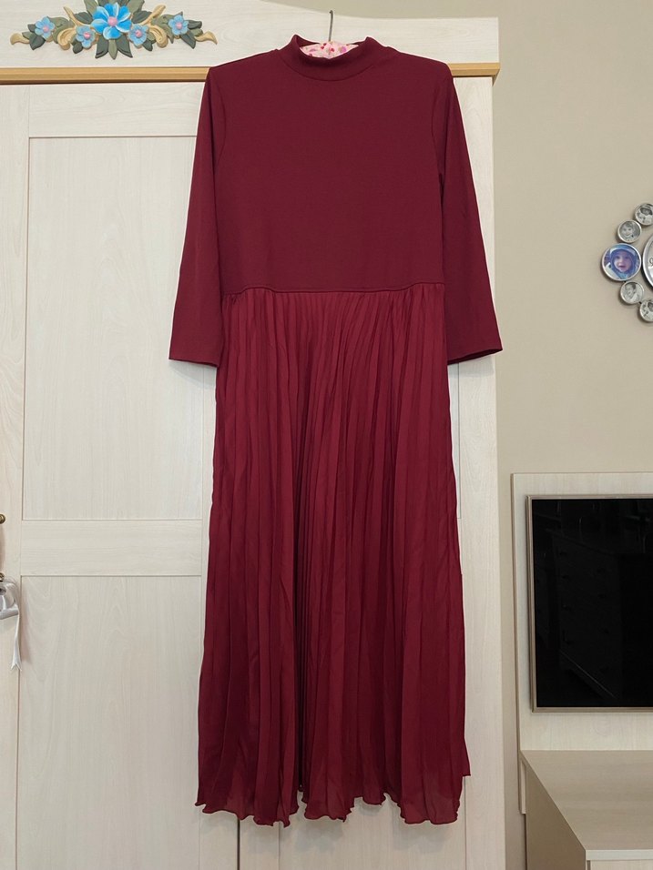 Bordo renk, eteği pileli, penye kumaş uzun elbise. Çok rahat ve şık bir elbisedir. Tesettürlü kadınlar içinde uygundur. Koltukaltı 48, bel 40, omuzdan boy 115 cm, esnek yapıya sahiptir.