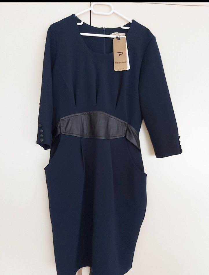 Koyu mavi mini elbise, uzun kollu ve kemer detaylı. Notch yaka ve regular fit ile ofis kullanımı için uygun.