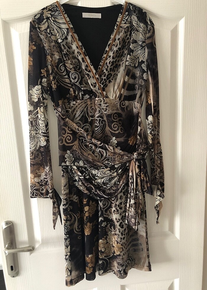 Şifon elbise spazzio marka 38 beden desenli bel kısmında kuşak detaylı ister ön ister arkadan şekil verilir v yaka kolları şifon ve modelli
