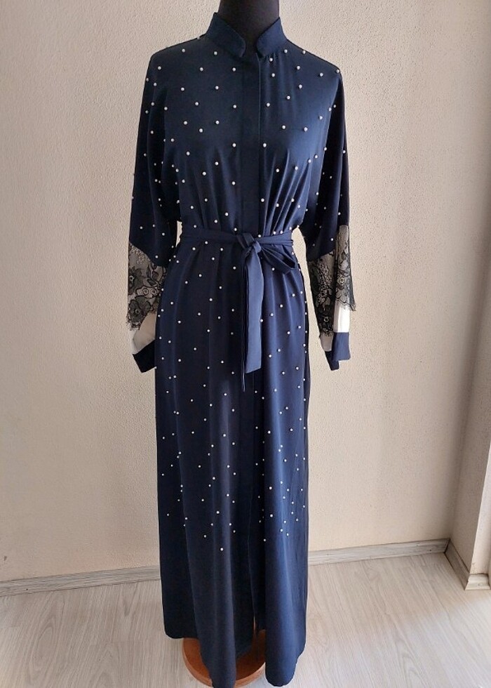 Lacivert üstünde inci detayları olan önden çıt çıt ile kapatılan bir kıyafet... ister elbise ister ferace olarak kullanılabilir.. 2 3 kez falan kullanılmıştır... 36 veya 38 bedenlere uygundur... boyu 142cm