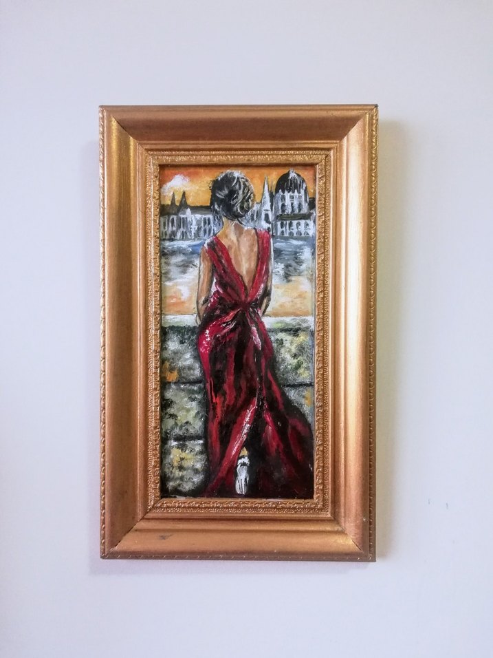 26*42 ölçülerinde çerçeveli tuval bez üzerine yağlı boya tablo. Parlak bordo elbise giymiş bir kadını ve şehir manzarasını gösteren, altın renkli çerçeveli tablo.