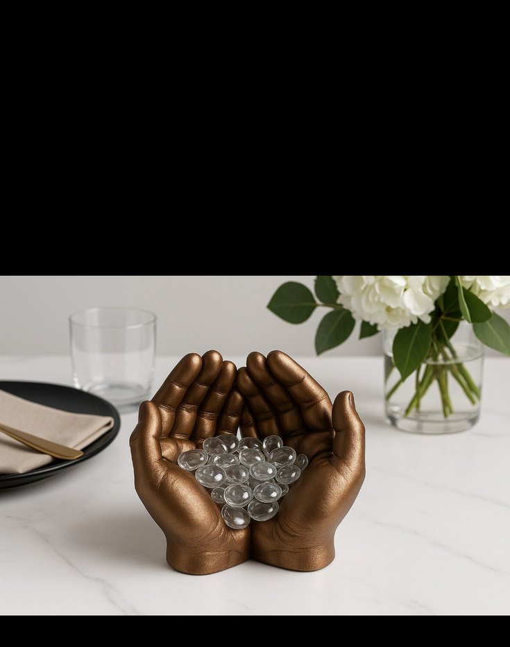 Bakır renkli açık eller şeklinde dekoratif kase. Küçük eşyalar veya kapsüller için uygundur. Masaya şık bir dokunuş katar.