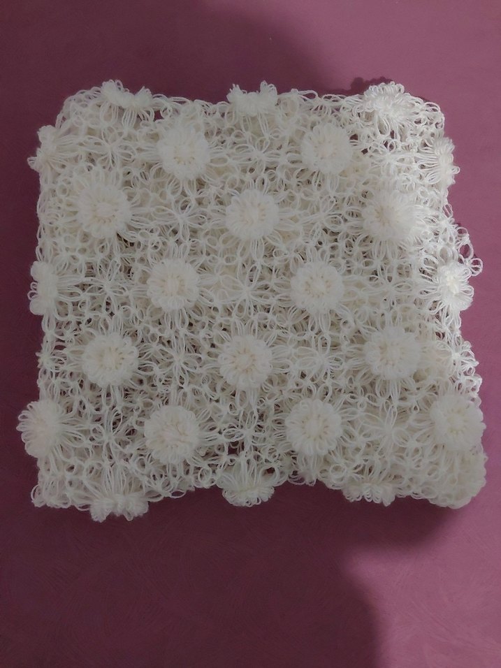 Beyaz elde örülmüş, bohem çiçek motifli dantel. İnce dokulu ve karmaşık halkalar içerir. Dekoratif kullanım için uygundur.