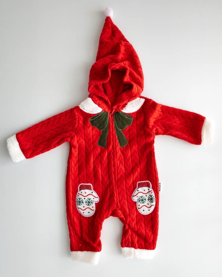 Canlı kırmızı renkli, örgü dokulu bebek tulumu. Nakışlı desenleri, kapüşonu ve ponponu ile sokak stili için uygundur. ❄️