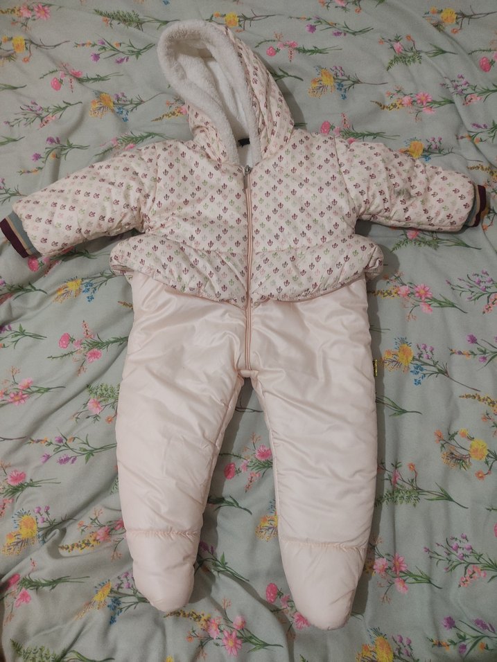Kız bebek için fermuarlı, kapüşonlu ve kesik yaka detaylı pastel beyaz tulum. Soğuk havalar için yumuşak dolgulu ve sıcak tutar. ❄️ kolunda lekesi var ama kullanıma engel değil 6 9 içindir