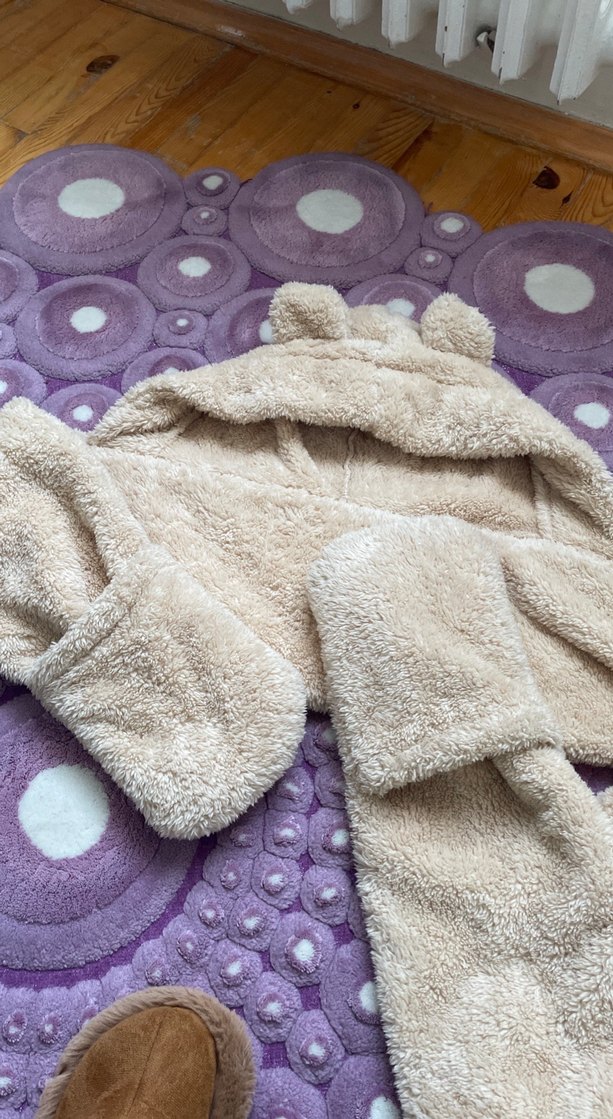 Krem rengi, yumuşak ve sıcak peluş kumaştan yapılmış bebek battaniyesi. Kulaklı kapüşonuyla çocukları sıcak tutar. Pastel tonlarda.