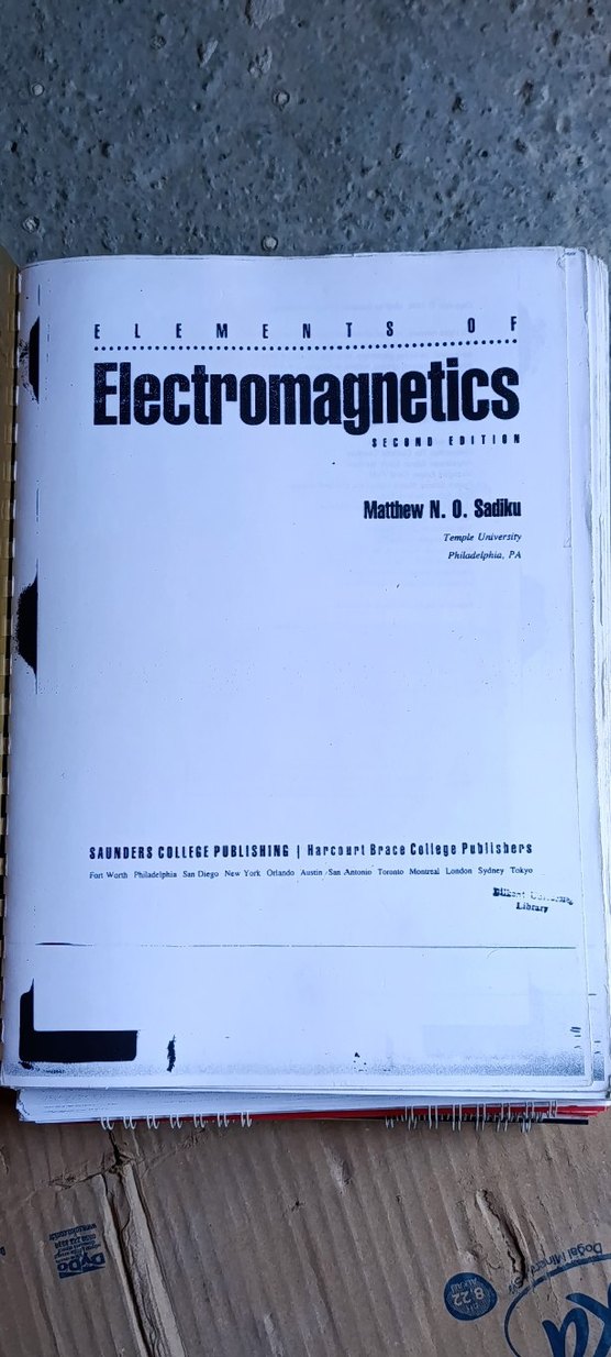 Matthew N. O. Sadiku'nun yazdığı "Elektromanyetik Elemanlar" kitabı temel elektromanyetik kavramları içerir. Electromagnetics SECOND EDITI0N Matthew N. O. Sadiku Temple University Philadelphia, PA SAUNDERS GOLLEGE PUBLISHING | Harcoapt Brace College Publisheps Font Worth Philadelphia San Diego New York Orando iAustin San Antonto' Toronto Montrcal London Sydney Tokyo Libtany