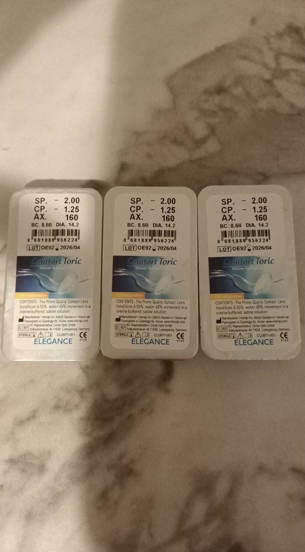 Elegance markalı, -2.00 SP, 1.25 CYL, 160 AX değerlerinde, 8.60 BC ve 14.2 DIA ölçülerinde 3 adet kontor torik kontak lens paketi.