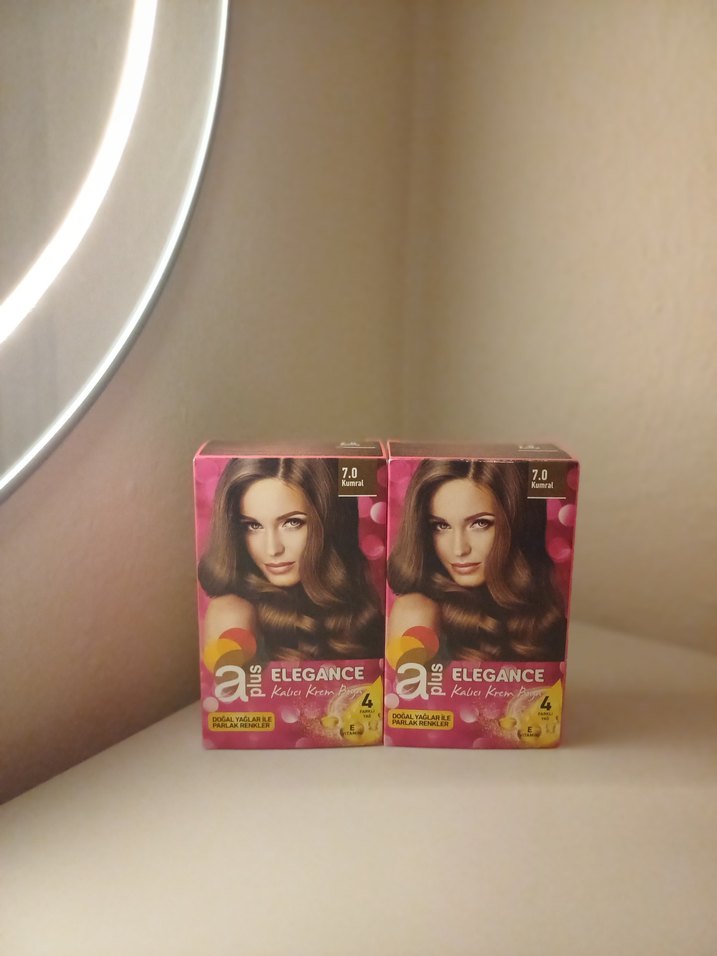 Elegance saç boyası 7.0 kumral, zengin renk ve pürüzsüz kapama sağlar. Pakette orta kumral saçlı bir kadın resmi ve saç besleyici içerikler bulunur.