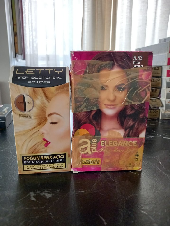 Elegance 5.53 Bitter Çikolata yoğun renk açıcı saç boyası, Letty saç açıcı tozu ile birlikte gelir ve canlı renkler sunar.