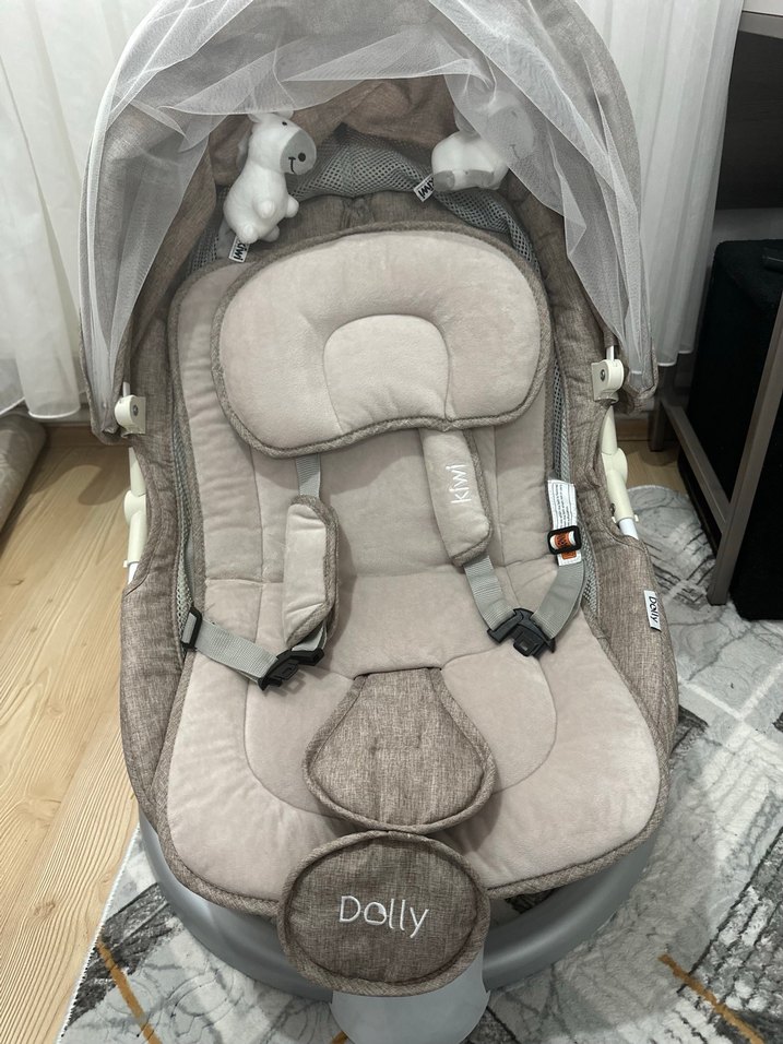 Yumuşak dolgulu ve emniyet kemerli elektrikli ana kucağı Baş destek yastığı ve iki küçük peluş oyuncak içerir. Marka: Dolly. Bebeğim içinde durmadı çok az kullanıldı