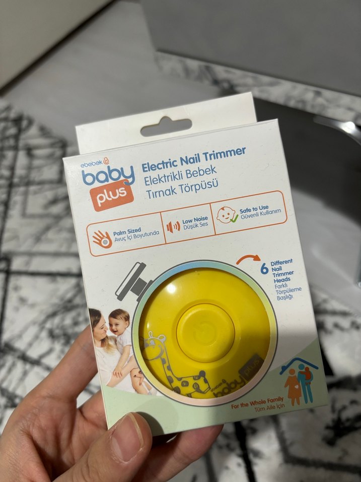 Altı farklı törpü başlığı, düşük sesli çalışma ve avuç içi boyutunda güvenli kullanımlı elektrikli bebek tırnak törpüsü sarı renkte.