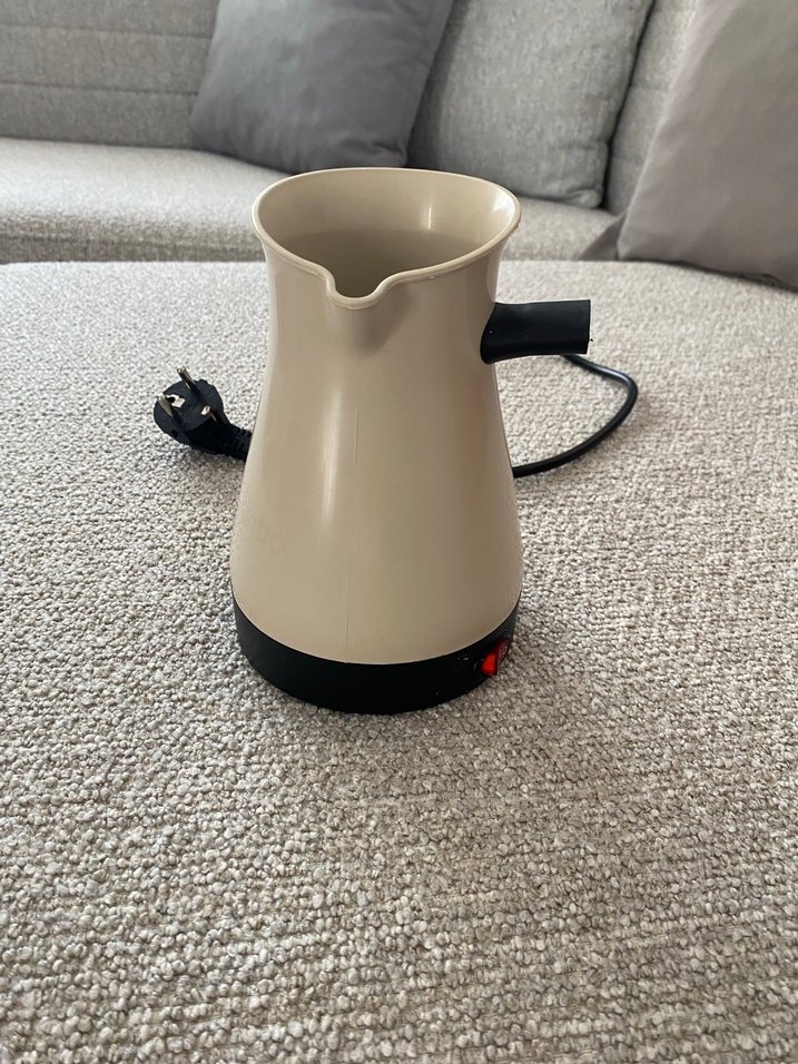 siyah tabanlı ve saplı elektrikli kahve makinesi. Kolay dökme için ağız kısmı ve açma-kapama düğmesi bulunur. ☕ sapı evde bulabilirsem sapıyla göndereceğim
