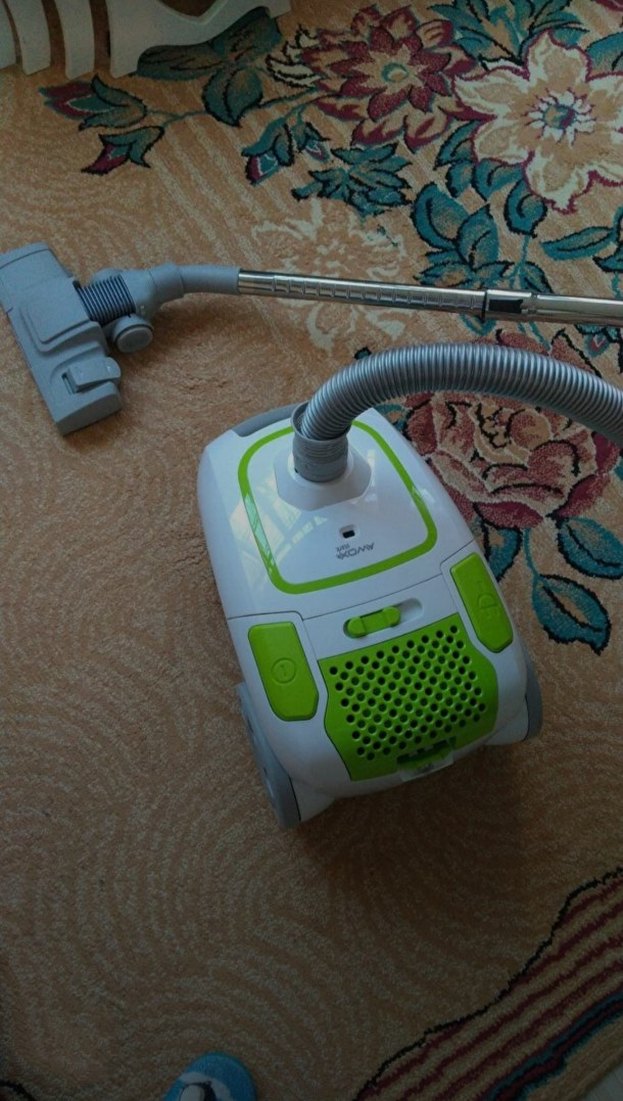 Renkli yeşil elektrikli süpürge, esnek hortum ve metal uzatma borusuna sahiptir. Gövdesinde kontrol düğmeleri bulunan kompakt tasarım.