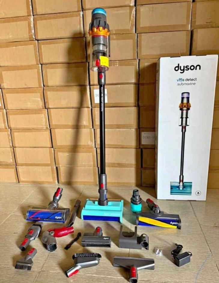 Dyson V15 Detect Submarine elektrikli süpürge, çoklu başlıklarla çeşitli temizlik seçenekleri sunar. Koyu ve çok renkli tasarıma sahiptir.