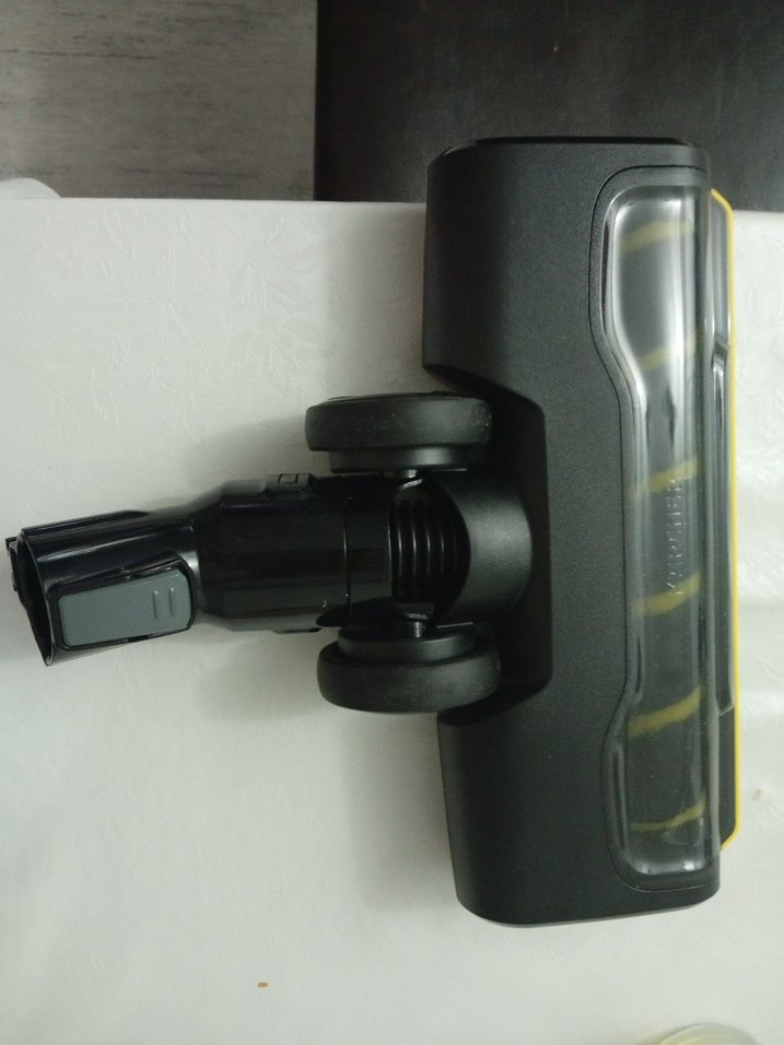 Siyah ve sarı renkte olan bu elektrikli süpürge başlığı, dönen fırça ve kolay hareket için tekerlekler içerir. Alman markası KARCHER