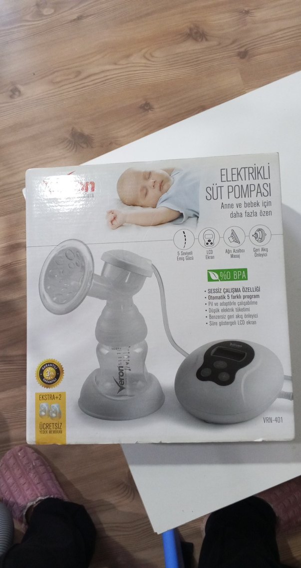 VRN-401 elektrikli süt pompası, sessiz çalışma, 5 emiş modu ve LCD ekran sunar. BPA içermez, anne ve bebek için uygundur. Ekstra aksesuarlar.