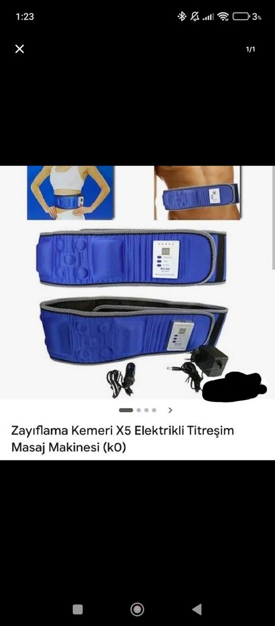 Mavi renkli, baskılı elektrikli titreşim ve masaj özellikli X5 zayıflama kemeri. Bel çevresinde kullanılır, kontrol paneli ve adaptörleri vardır.