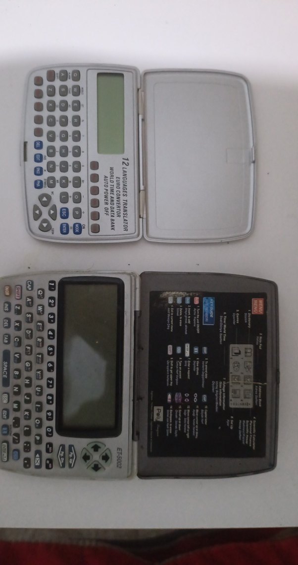 ürün hakkında pek bir bilgim yoktur bu şekilde satılıktır pil yoktur çalışıyor diye biliyorum iadesi yoktur fiyat uygun tutulmuştur Küçük klavyeli ve ekranlı beyaz ve gri iki elektronik çeviri cihazı, dil çevirisi için tasarlanmıştır.