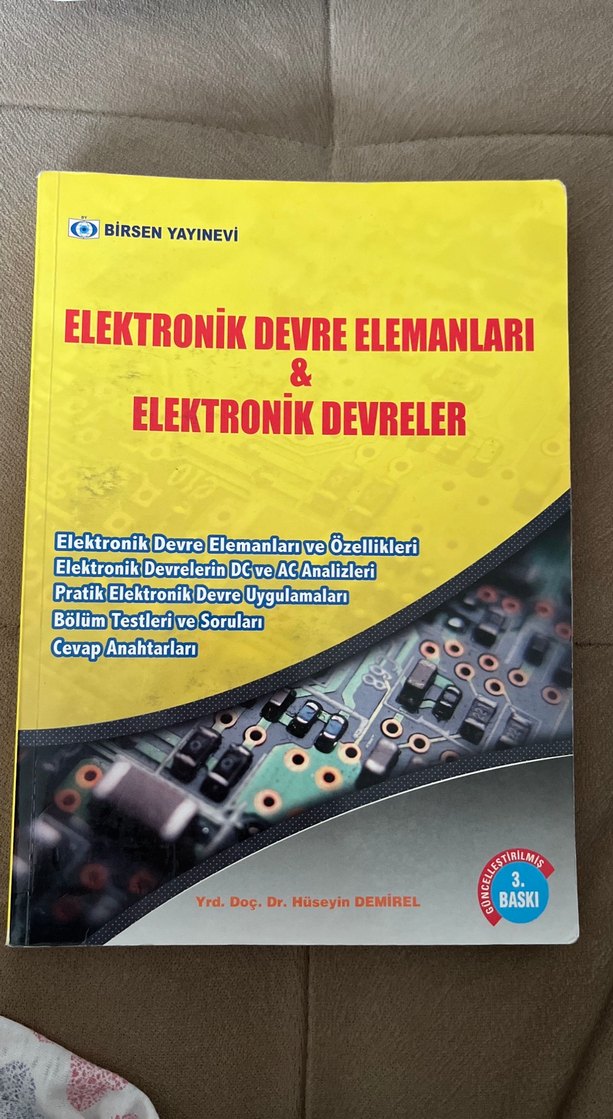 Elektronik devre elemanları, DC ve AC analizleri, pratik uygulamalar, testler, sorular ve cevap anahtarları içeren bir kitap.