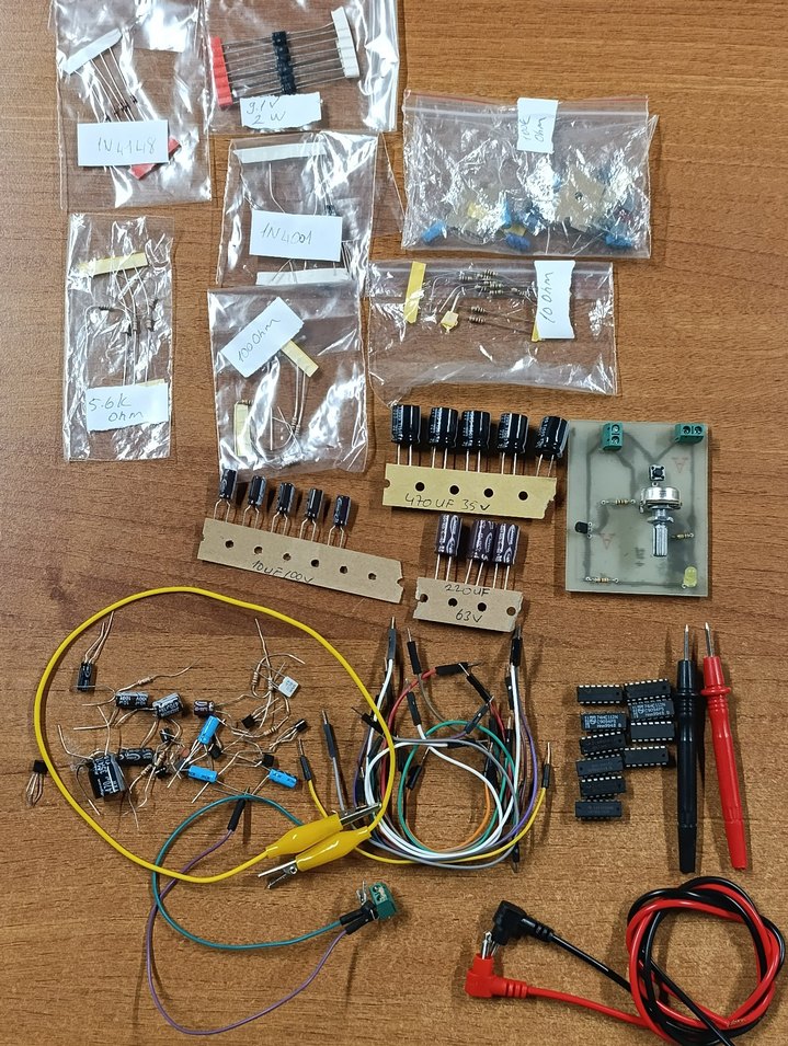 Çeşitli dirençler, kondansatörler, kablolar ve devre kartları içeren elektronik parça seti. Test probları da bulunmaktadır. ⚡