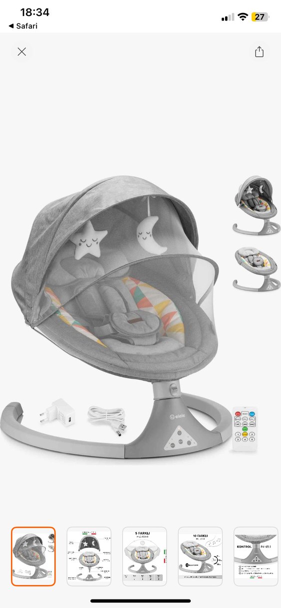 Yumuşak pedli, tente ve asılı oyuncaklı gri bebek salıncağı. Uzaktan kumanda ve USB şarj cihazı dahil. Bebekler için rahatlatıcı. elele dormire 2