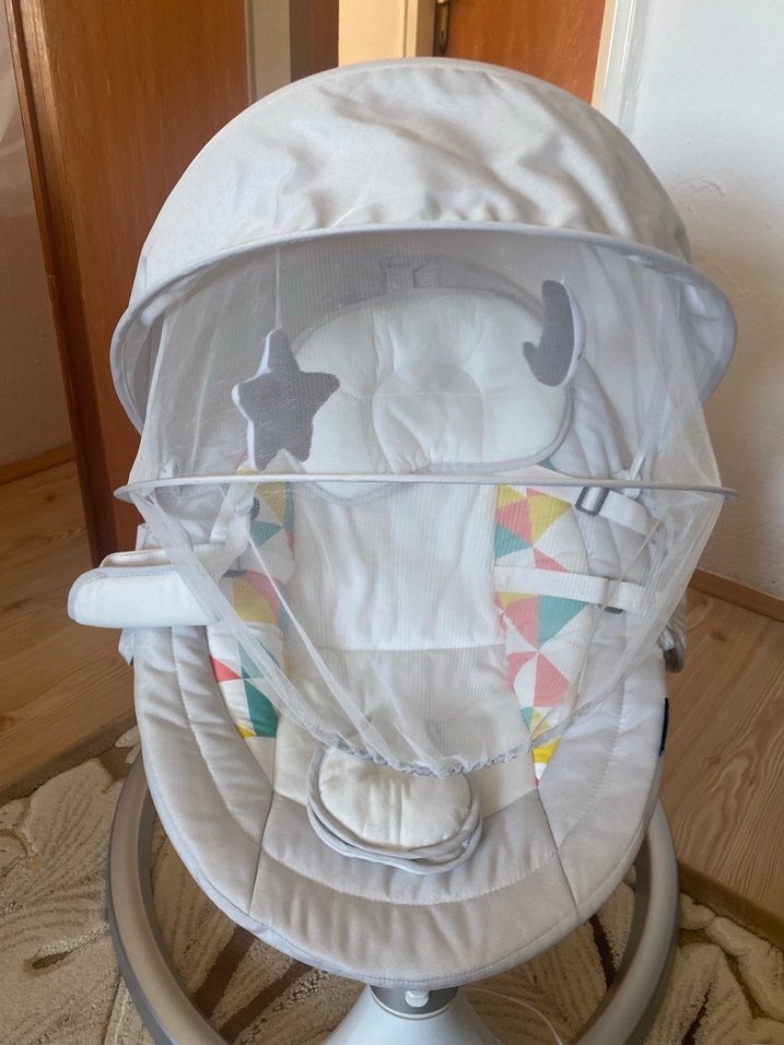 Kızımıza almıştık yenidoğanken uykusuna dalmasına çok yardımcı oluyordu çok temiz kullanildı çünkü farklı bir anakucağI daha almıştık dönüşümlü biniyordu ihtiyaç fazlası satıyoruz her aksamı çalişıyor düşünün o kadar az kullanıldiki kumandasının jelatini bile çıkarıimadı 2 yil garantisi devam ediyor ses sistemi müziği dokunmatik tuşu kumandası her şeyi çalişıyor.Paketledik kaldırdik alacak olana hayırlısı olsun diliyorum. #eleleanakucağı #eleledormire2 #anakucağı , yumuşak sentetik kumaş ve renkli geometrik desen detaylarıyla. Yıldız ve ay mevcut