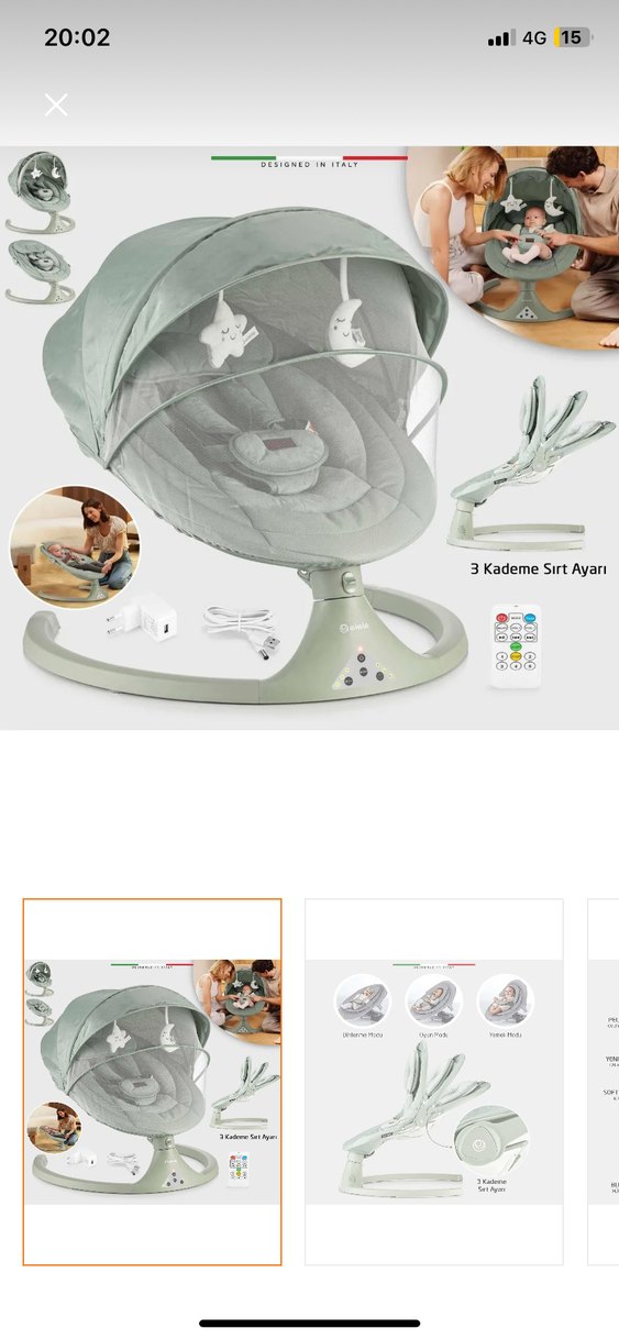 3 kademe ayarlanabilir sırt ayarı Portatif yapısı sayesinde tek hamlede kolay kurulum Hafif yapısı sayesinde kolay bir şekilde taşınabilme Doğumdan itibaren 13 kg’a kadar taşıma kapasitesi Otomatik sallanma fonksiyonu Kontrol paneli Bütün özellikleri ayarlayabileceğiniz uzaktan kumanda 10 farklı melodi seçeneği 8/15/30 Dakika sürelerine ayarlanabilen 3 farklı zaman ayarlayıcı sistemi 5 nokta emniyet kemeri Zaman ayarlama seçeneği 5 kademeli hız ayarı seçeneği Yumuşak dokulu 2 adet peluş oyuncak Ayarlanabilir, çıkarılabilir tende, oyuncak ve sineklik Bluetooth bağlantısı Bluetooth bağlantısı ile telefon bağlaya bilme Ekstra dolgulu soft peluş minder, baş desteği ve omuz pedi Sabitleme butonu Adaptör bağlantısı Dışarı veya ev içi kullanımda Pil(4 adet AAA) ile çalıştırabilirsiniz. Hiç kullanılmadı kutusuyla teslim edilir Sadece kutudan çıkarken minik ayağında çizik var fotoğrafta belirtikdi okadar