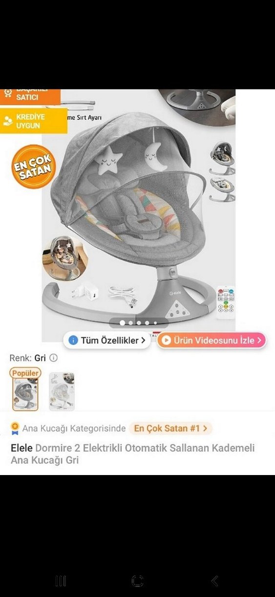 Elele Dormire 2 gri renkli, elektrikli otomatik sallanan ana kucağıdır. Ayarlanabilir sırt pozisyonu ve uzaktan kumanda ile kolay kullanım sunar. Yumuşak tül tavanı vardır. pazarlık olur. Ürün orijinal kutusunda gelecek. ürün sıfır ayarında benim bebeğim sevmedi kullanamadım .