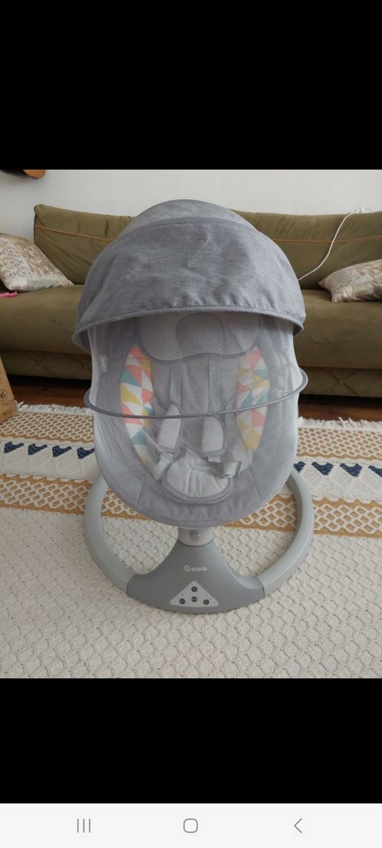 Gri renkli bebek beşiği, yumuşak tente ve hava alabilen file yanlara sahiptir. Renkli desenli yastıklı oturma alanı ve sağlam taban bulunur. ️bütün aparatları vardır,müzik sorunsuz çalmakta.uzaktan kumandası sorunsuzdur.