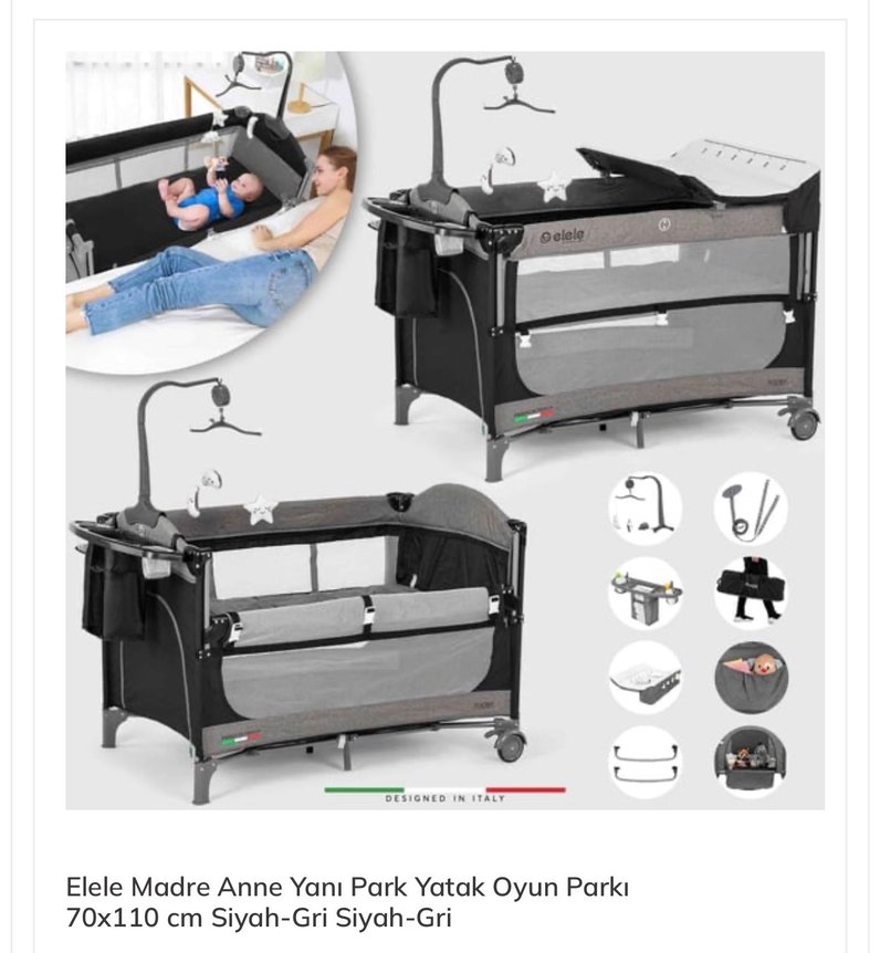 siyah-gri renkli, yan cepli ve oyuncaklı mobil barı bulunan bebek oyun parkı ve park yatağı. Güvenli oyun ve dinlenme için uygun. Sadece oyuncaklarından bir tanesinin ipi açıldı onun dışında bir kusuru yok.