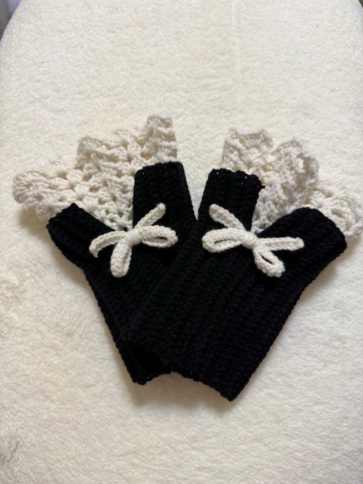 Siyah örgü eldivenler, beyaz dantel ve fiyonk detaylarıyla rahat ve gotik tarzı bir araya getiriyor. Son fiyattır istenilen renk çalışılır
