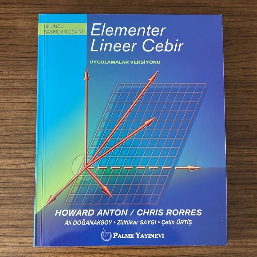 Elementer lineer cebir konularını uygulamalarla anlatan kitap. Howard Anton ve Chris Rorres tarafından yazılmış, Ali Doğanaksoy, Zülfukar Saygı, Çetin Örti tarafından çevrilmiştir. Palme Yayinevi yayınevi.