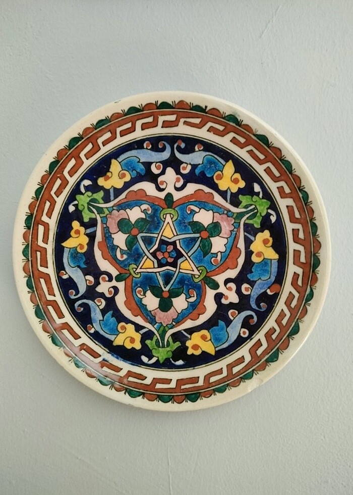 Elhamra soğuk damgalı .22 cm çapında.Asma aparatı var. Kenarında sır atığı var.Boya kısmına denk gelmediği için farkedilmiyor.Resimde gösterdim.#elhamra #kütahyaçini #duvartabağı