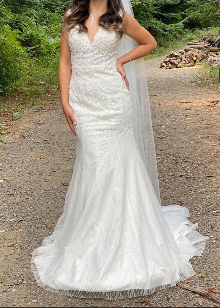 Çekim ve nikah günü giyildi. Balık model ve kuyruk detaylıdır. Gelinlik, astarı+uzun duvağı ve tacı ile birlikte gönderilecektir. Gelinliğin omuzdan itibaren boyu 153cm, iki göğüs arası ölçümü 39 cm’dir.