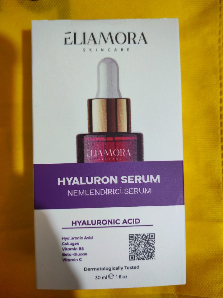 Eliamora Hyaluron Serum, hyaluronik asit, kolajen, B5 vitamini, beta-glukan ve C vitamini içerir. Dermatolojik olarak test edilmiş nemlendirici serumludur.
