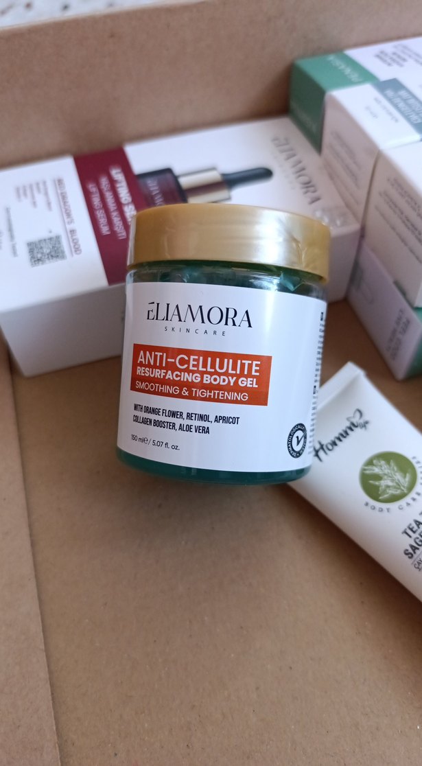 Eliamora Selülit Karşıtı Vücut Jeli, portakal çiçeği, retinol, kayısı, kolajen destekleyici ve aloe vera ile cildi pürüzsüzleştirir ve sıkılaştırır.