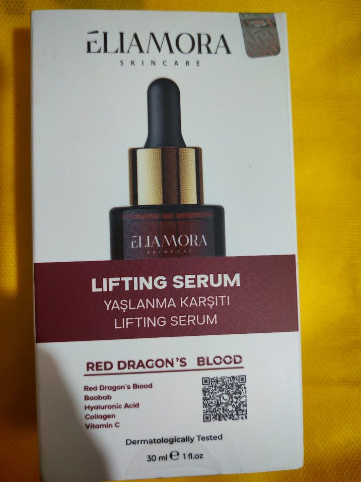 Eliamora Lifting Serum, Yaşlanma karşıtı formülde Red Dragon's Blood, Baobab, Hyaluronik Asit, Kolajen ve C vitamini içerir. Dermatolojik olarak test edilmiştir. 30 ml.
