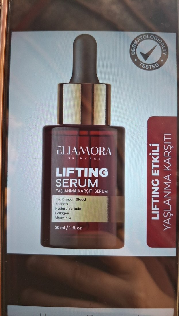 Eliamora'nın Red Dragon Blood, Baobab, Hyaluronik Asit, kolajen ve C vitamini içeren 30 ml'lik yaşlanma karşıtı etkili lifting serumu. Dermatolojik olarak test edilmiştir. ✨ Hergun düzenli kullanınca etkisi olur alın aldırın düzenli kullanımda faydası olur trendyoldan aldım kullanımı nasil yorumları okuyup alabilirsiniz