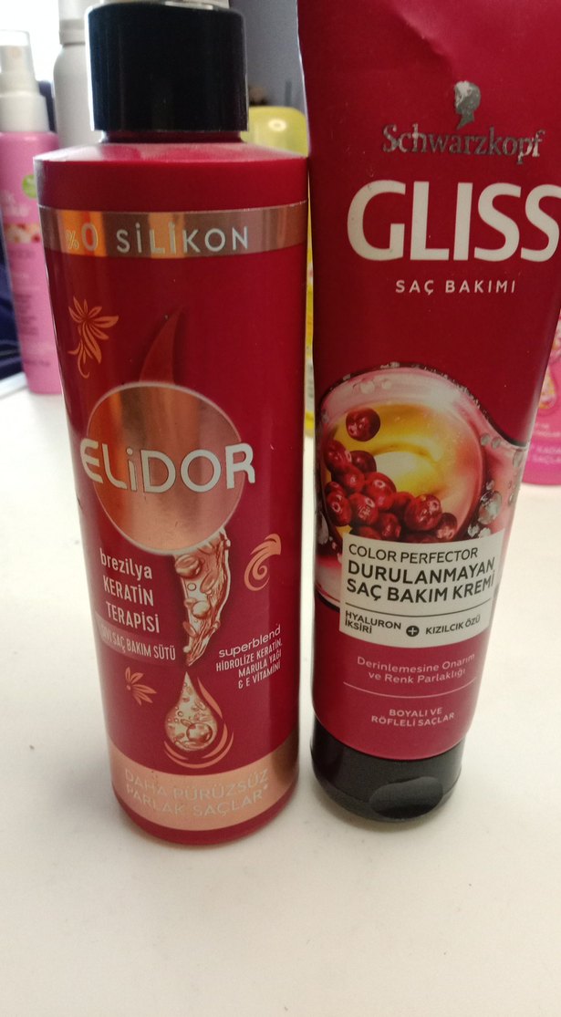 Elidor Brezilya Keratin Terapisi saç bakım sütü silikon içermez, derinlemesine bakım ve parlaklık sağlar. Schwarzkopf Gliss Color Perfector saç kremi renk koruyup keratin ve hyalüronat ile güçlendirir. ♀️