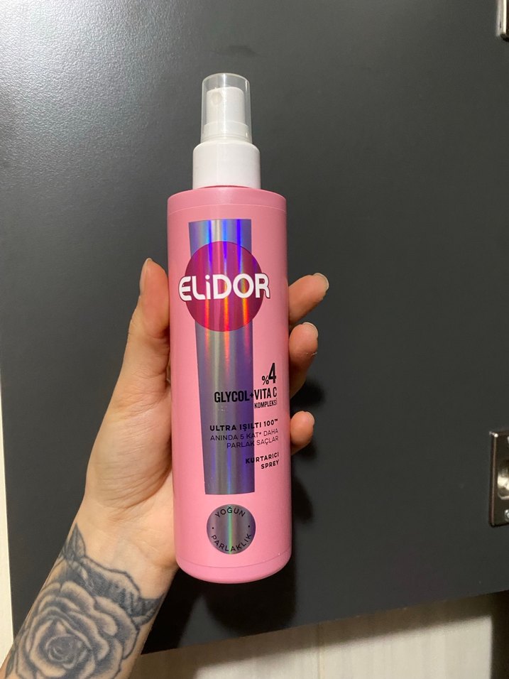 Elidor Glycol + Vita C saç bakım spreyi, saçlara ultra hafif koruma ve onarım sağlar, parlaklık ve yumuşaklık kazandırır.