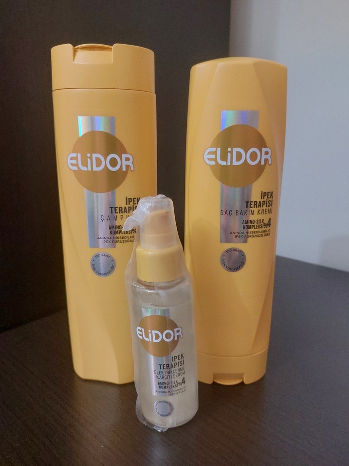şampuan 180tl ,krem 160tl, serum 200 tl dir Elidor İpek Terapisi şampuan, saç bakım kremi ve serum içerir; saçı besleyip yumuşatır. ♀️